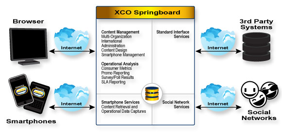 XCO Springboard leverages database technologies throughout. Those hosting Springboard may choose between Sun's mySQL or Microsoft's databases (with Oracle 11g following). Each smartphone Application incorporates a small but powerful data repository to manage local content and to collect detailed operational metrics. At appropriate times, information is frugally moved between the enterprise and smartphones without interrupting the fan. Importantly, the architecture establishes a configurable and flexible approach to smartphone content caching.